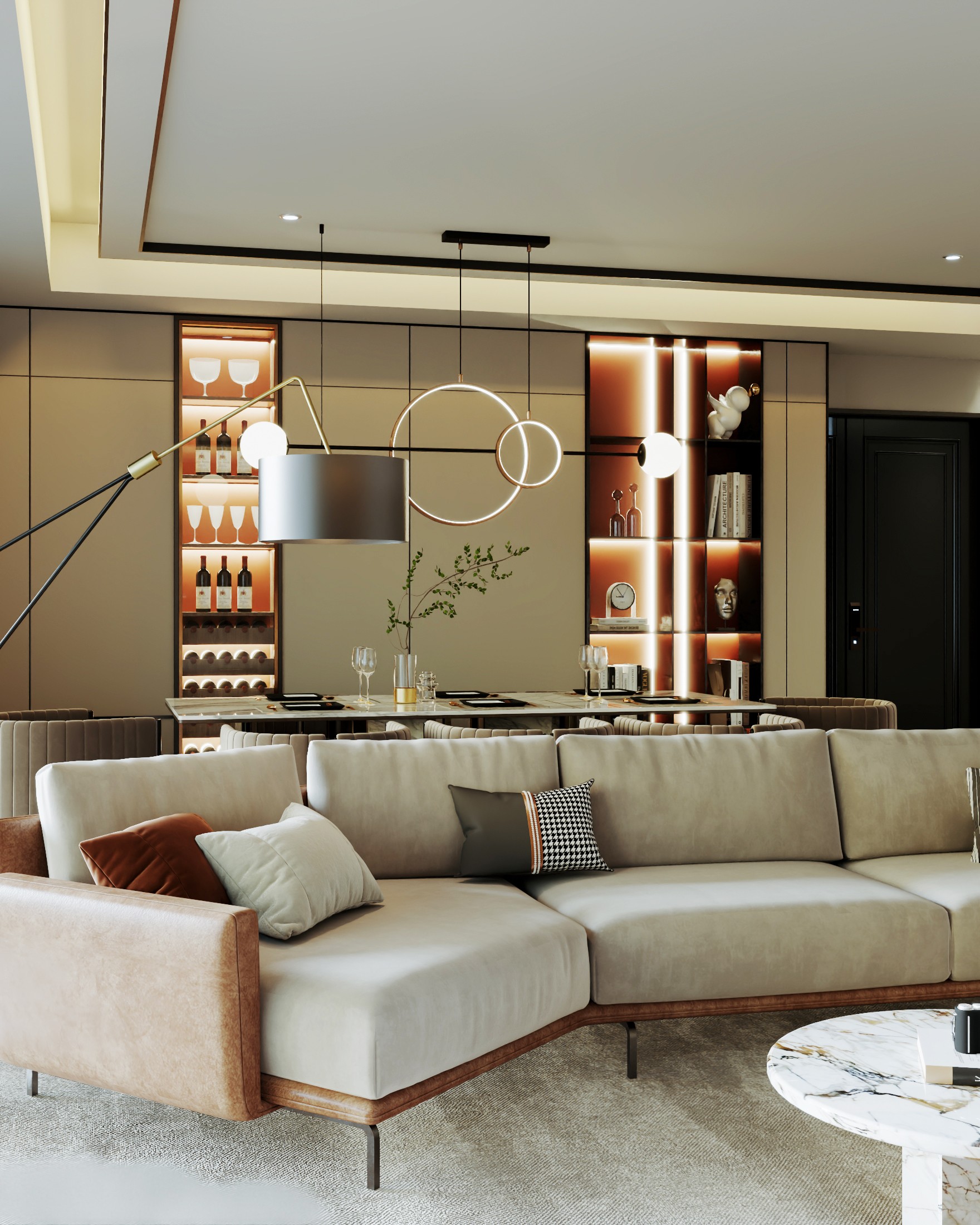 The space blends sleek, modern lines with inviting textures, creating a harmonious setting where every detail contributes to a stylish and serene retreat. This approach transforms your living area into a chic sanctuary, combining the best of modern sophistication with ultimate comfort.